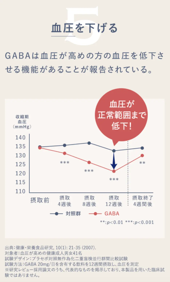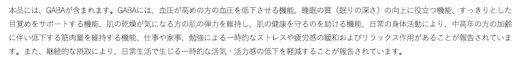 *GABAのみを関与成分としかつテアニンを配合した商品において、血圧が高めの方の血圧低下、睡眠等を含む